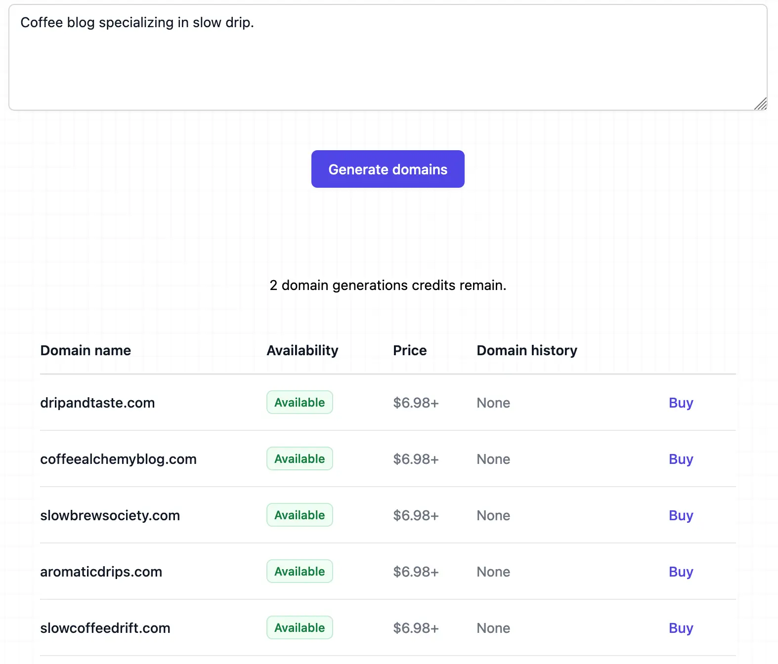 Click to Generate: Once you're satisfied with your description, click 'Generate domains' to see the AI's suggestions.
